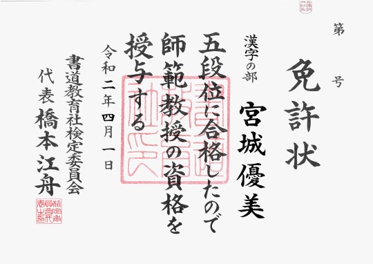 漢字の部 五段位師範教授免許状